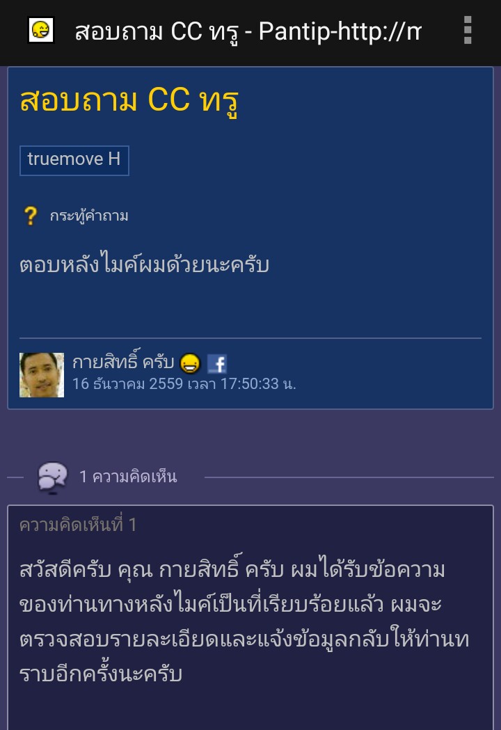 สอบถามไปทางหลังไมค์ทรูยังไม่ให้คำตอบเลยรออยู่5 ชั่วโมงกว่าแล้วติดต่อไปตั้งแต่พลบค่ำตอบหน้าไมค์แก้ตัวไปวันๆหรือเปล่าครับไม่คอยเซอร์วิสบริการเลยครับ ผมยอมค่ายสีเขียวแล้วครับเอาใส่ใจลูกค้าเป็นอย่างดี มีเรื่องปรึกษาค่ายสี่เขียวเขาจะให้คำตอบอย่างรวดเร็วมากๆ เรื่องที่ผมจะปรึกษาทรูตามภาพเลยครับ
