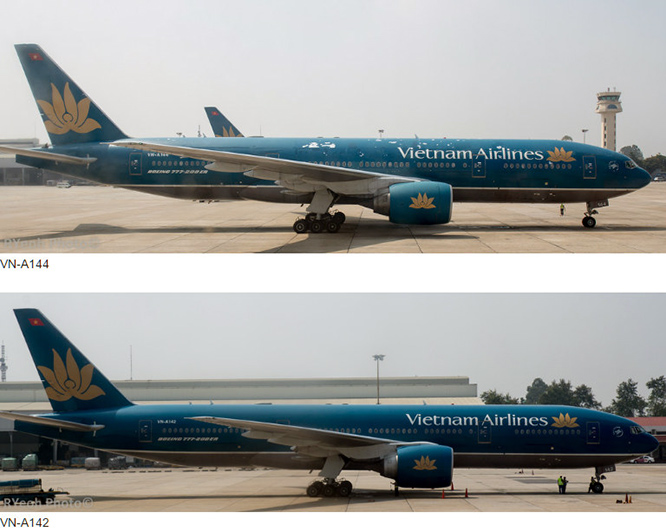 โบอิ้ง 777-200ER หมายเลข VN-A144 กับ VN-A142 ที่สนามบินโนยบ่าย กรุงฮานอย จากเว็บไซต์ Malaysianwings.Com เป็นสองในสี่ลำ ที่เวียดนามแอร์ไลน์ส นำออกขาย หลังจากนี้ในฝูงจะเป็นรุ่นใหม่ทั้งหมด รวมทั้งเครื่องบินลำตัวกว้าง ทั้ง Boeing 787-9 และ แอร์บัส A350XWB รวมกันถึง 33 ลำ A321 อีก 49 ลำ กับ A330 อีก 10 ลำ.