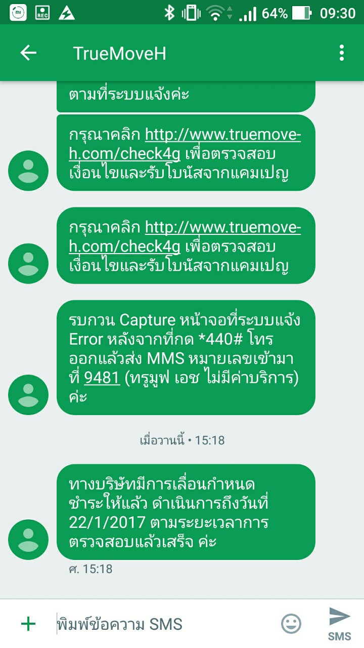 2. ผลจากข้อ 1 ขอให้ทรูทำการเลื่อนการตัดสัญญาณโทรศัพท์เนื่องจากอยู่ระหว่างตรวจสอบค่าใช้จ่าย ซึ่งรับทราบและจะบันทึกปัญหาให้ และในวันที่ 14 ธันวาคม 2559 ก็โดนตัดสัญญาณอีกครั้ง และวันที่ 16 ธันวาคม 2559 ก็โดนอีกครั้ง[Spoil] คลิกเพื่อดูข้อความที่ซ่อนไว้ ทั้งที่มีการเลื่อนวันให้จนกว่าจะตรวจสอบเสร็จ