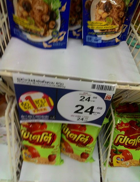 ที่ชั้นจะมีป้าย 1 แถม 1 ทุกรส แต่เวลาคิดเงิน จะมี 2 รส ที่ไม่ลดราคาให้