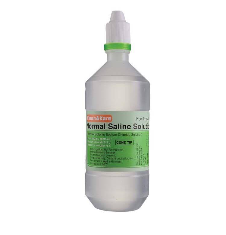 4. ใช้น้ำเกลือเช็คหน้าอีกรอบ เทน้ำเกลือลงในสำลีแล้วเช็ค เพราะน้ำประปาที่เราใช้อาจยังไม่สะอาดเพียงพอ ราคาประมาณ 60 บาทไม่น่าเกิน