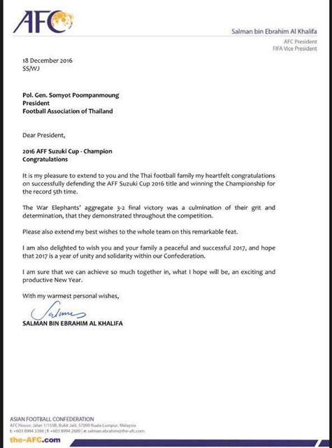 ประธาน AFC ร่อนสาส์นแสดงความยินดี ที่ทีมช้างศึกคว้าแช้มป์ AFF Suzuki Cup 2016 มาครอง