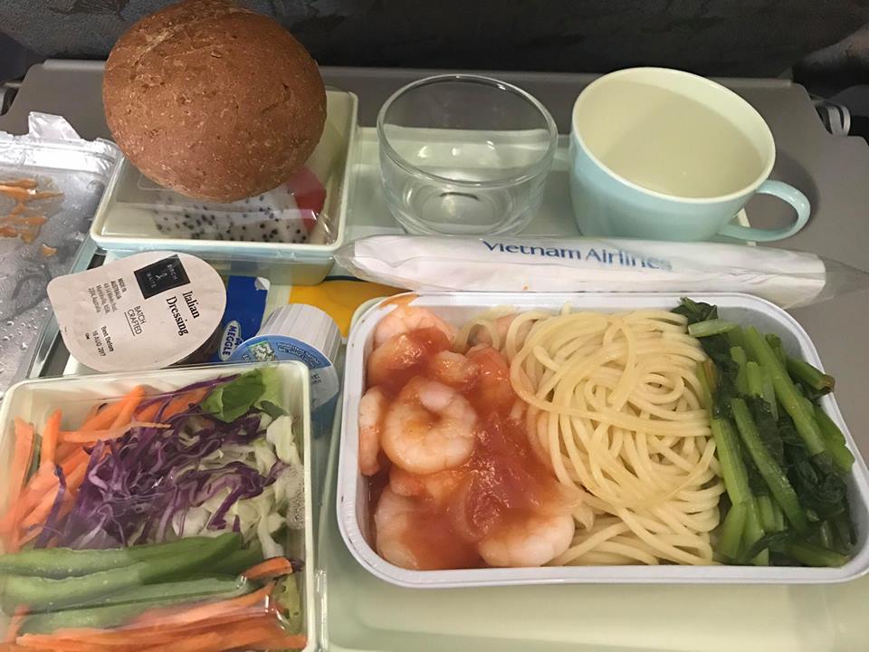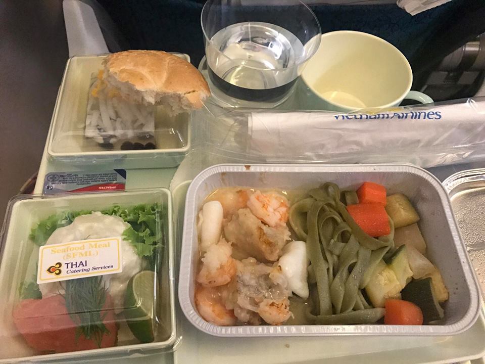 พอเครื่อง Take–off ไม่นานก็เริ่มแจกน้ำก่อน มีหลากหลายชนิด ไวน์แดง ไวน์ขาว วิสกี้ เบียร์ น้ำอัดลม น้ำผลไม้ และตามด้วยอาหาร ส่วนตัวเรารีเควสไปว่าขอเป็นอาหาร Seafood แอร์เอามาให้ก่อน เลยได้ทานก่อนเพื่อน อาหารสำหรับเราโอเค รสชาติพอได้ค่ะ เค้าทำรสชาติกลางๆ ไม่แย่นะ (ขนมปังมีรอยกัดไปหน่อย พอดีเพิ่งนึกขึ้นได้ว่าจะถ่ายรูป ขอโทษด้วยค่ะ)