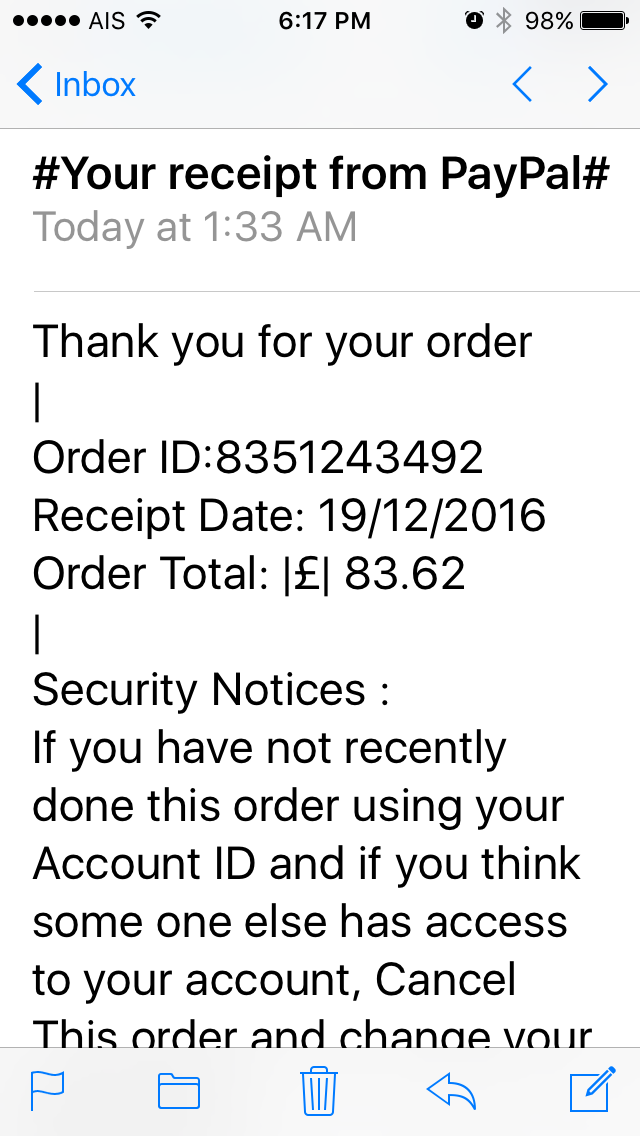 เมื่อคืนผมได้รับอีเมล์จาก Paypal ทันทีที่ได้รับผมรู้ได้ว่าเป็นอีเมล์ปลอม เพราะผมไม่มีบัญชี Paypal ตามรูป ตอนแรกผมเข้าใจว่าเป็นอีเมล์ที่แนบลิงค์พาไปสู่หน้าเวบไซค์ปลอม (phishing) เหมือนกับที่เคยเจอม