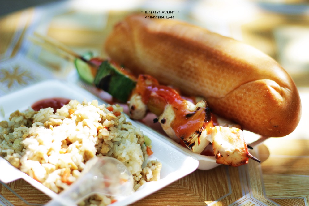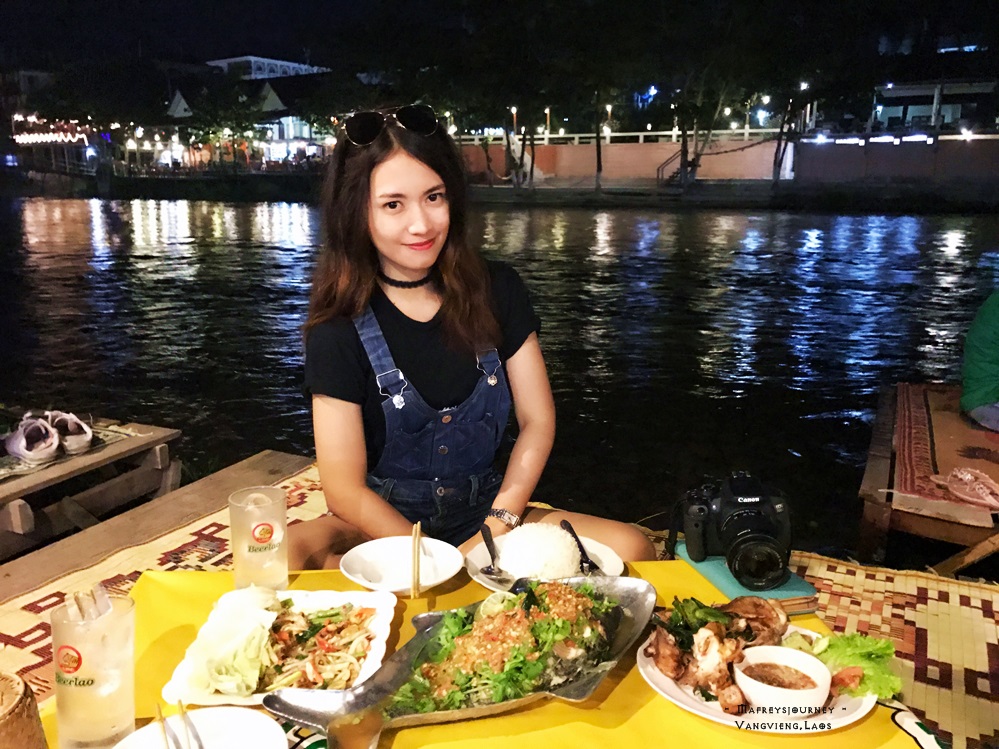 เราหาร้านติดริมแม่น้ำซอง เพื่อหาข้าวลงกระเพาะกัน