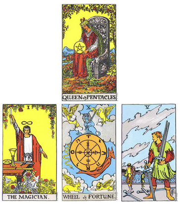 1. The Tower 2. The Chariot 3. THE NINE OF WANDS 4. FIVE OF SWORDS 5. The Fool 6. THE PAGE OF SWORDS 7.THE QUEEN OF WANDS 8.THE QUEEN OF SWORDS 9. The Devil 10. ACE