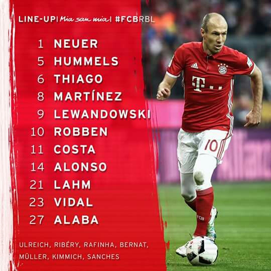 -Lineups- FC Bayern München สวัสดีมิตรรักเเฟนพี่เสือทุกท่านนะคะ วันนี้พี่เสือบุกไปเยือนกระทิงหนุ่ม ไลป์ซิก นัดนี้ปู่พักสองปีกปีศาจร็อบเบรี่ พี่บัว พี่หล่อเลวาน โดยเเดนหน้าจะมีสไตรค์เกอร์สปี