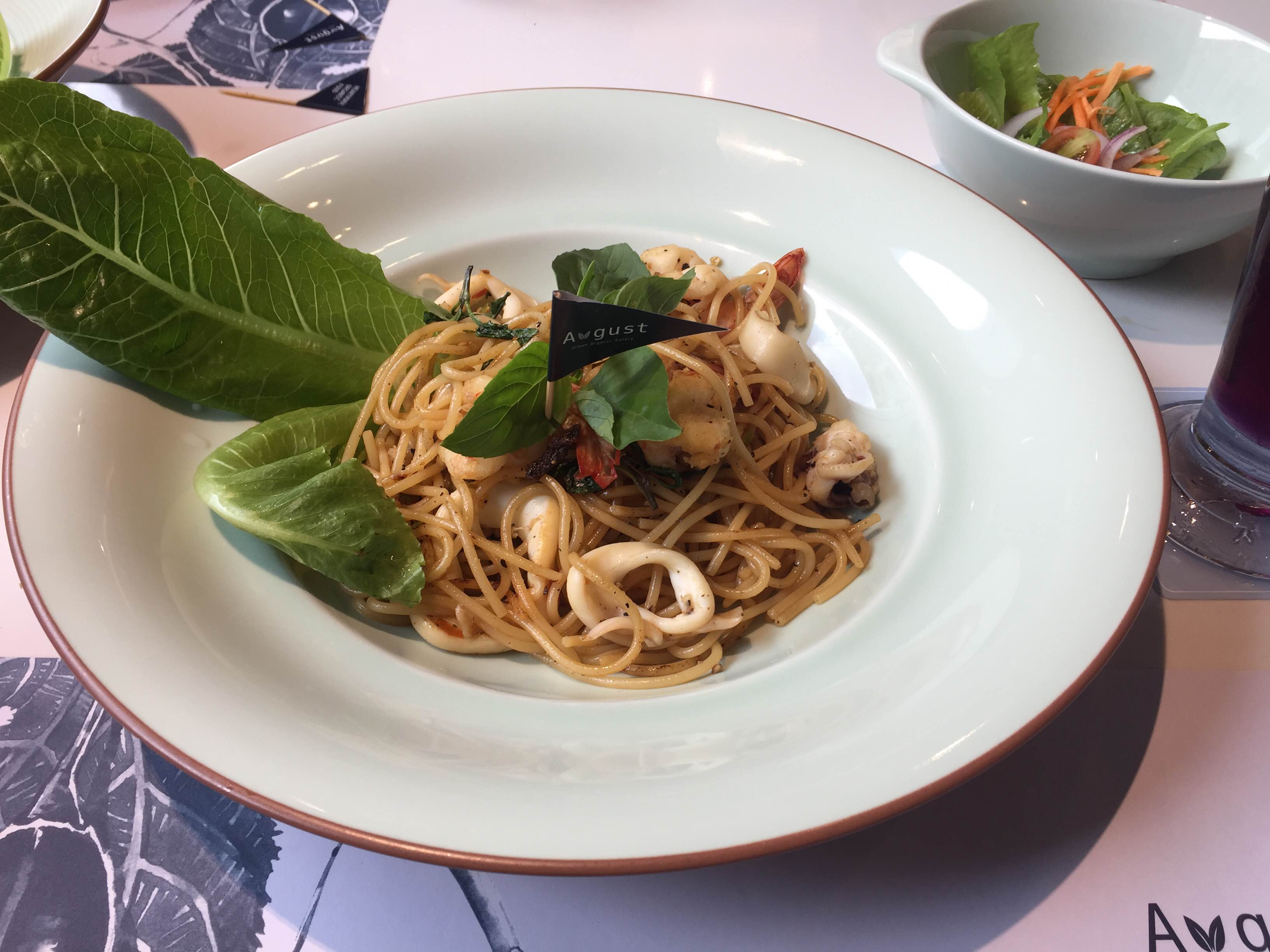 ผมเลือกสปาเก็ตตี้ทะเลผัดพริกขี้หนูสวนมาครับ ถ้าจำไม่ผิดเซ็ตนี้ ราคา 200 บาทถ้วนครับ เป็นเมนูที่อยู่ในโปรโมชั่น ที่ชอบก็คือ จะมีสลัด กับน้ำอัญชัญมาให้ด้วยครับ