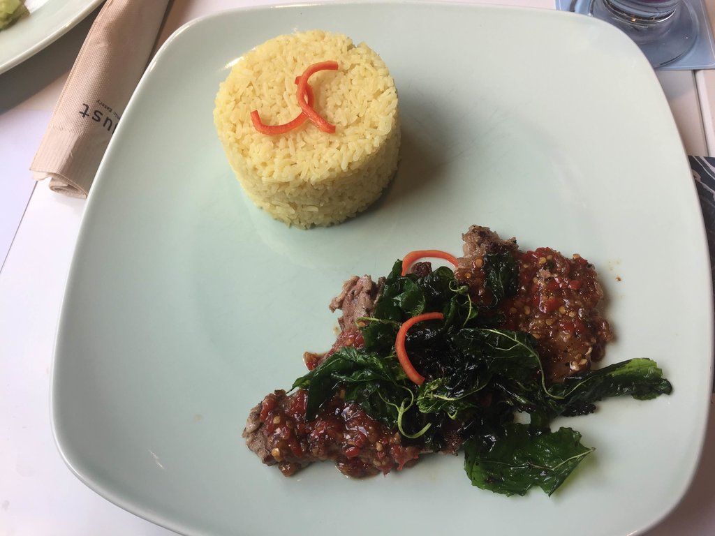 อันนี้เป็นของเพื่อนผมอีกคนครับ รู้สึกจะเป็นเมนูที่อยู่ในโปรโมชั่นเดียวกับผม อันนี้คือ 'เนื้อย่างซอสกระเพรา' เห็นเพื่อนบอกว่าอร่อยยย สเต๊กย่างมาไม่แข็งเกินไป รสกระเพราจัดจ้าน สรุปจานนี้เพื่อนผมให้ผ่านครับ