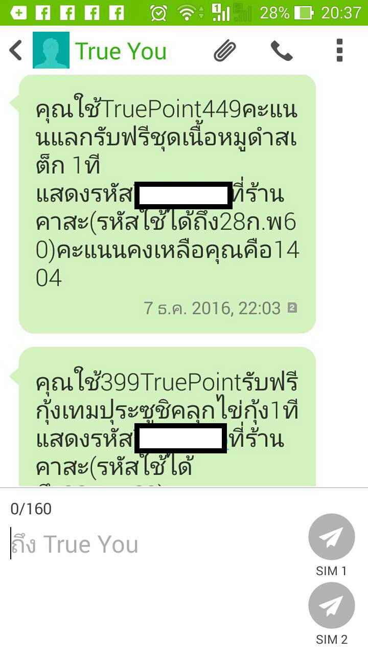 [Spoil] คลิกเพื่อดูข้อความที่ซ่อนไว้เมื่อวันที่ 7/12/59 เดินเข้าไปถามที่เคาเตอร์ด้านในร้านอาหาร สาขาซีคอนบางแค ปรึกษาเรื่องการกดแต้มทรู