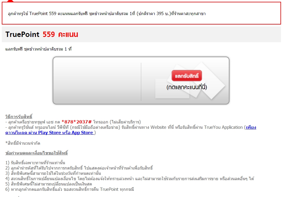 กดแลกแต้ม true point ได้ code แลกอาหาร ผ่านไป 15 วัน นำไปใช้ที่ร้าน พนง. บอก "รหัสต้องกดทันทีตรงนั้น หรือไม่เกิน 1 วัน"