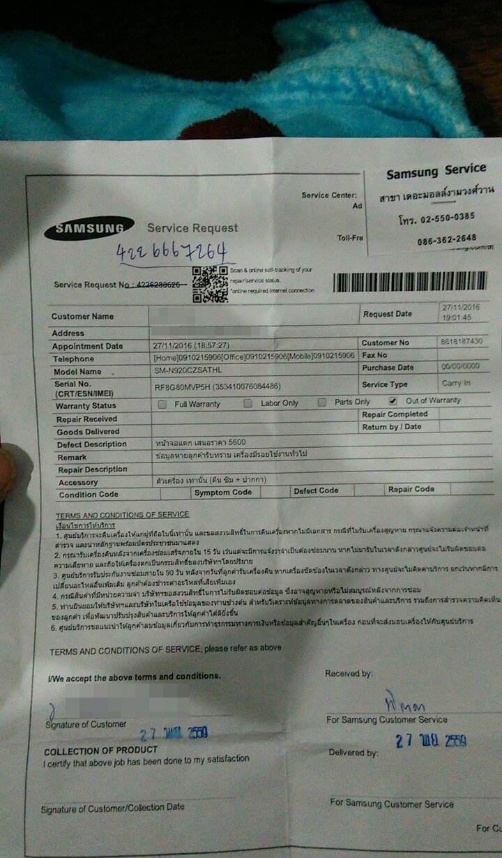 พอดีผมส่งเครื่อง (Note 5) ซ่อมตั้งแต่สามอาทิตย์ที่แล้ว (ในใบรับของบอกว่าแค่อาทิตย์เดียว)