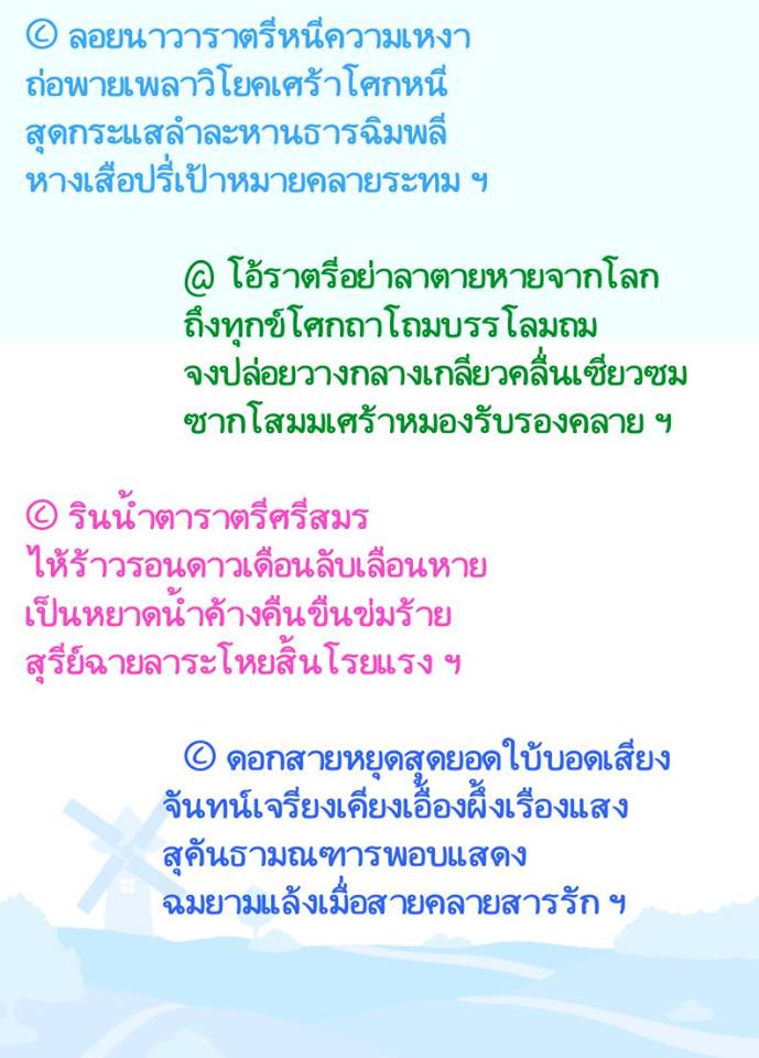 @ เดียวดายกลางสายลมชมจันทร์ดาว ๒ ท่องพารา คราค่ำ ย่ำราตรีดวงฤดี สลักรอย คอยเพียงเขายินสำเนียง เสียงเพลง บรรเลงเบารู้สึกเหงา เร้ารุก ปลุกห้วงวิญญ์ จึงประพันธ์ กลอนไว้ ให้สดับประจักษ์รับ รอยซึ้ง ตรึงถวิ