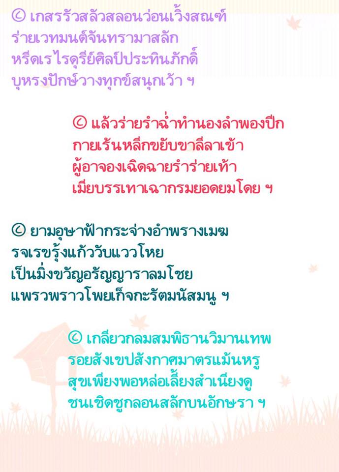 :):):):) ปลดปลงปลดปลิวปลดปล่อย ล่องลอยล่องแล้วล่องลับ นานเนิ่นนานนักนานนับ จบจับจบจากจบจริง รักร้อนรักรอนรักร้าว ดวงดาวดวงดับดวงดิ่ง ชักเชือนชักช้ำชักชิง สิ้นสุดสิ้นสิ่งสิ้นสราญ