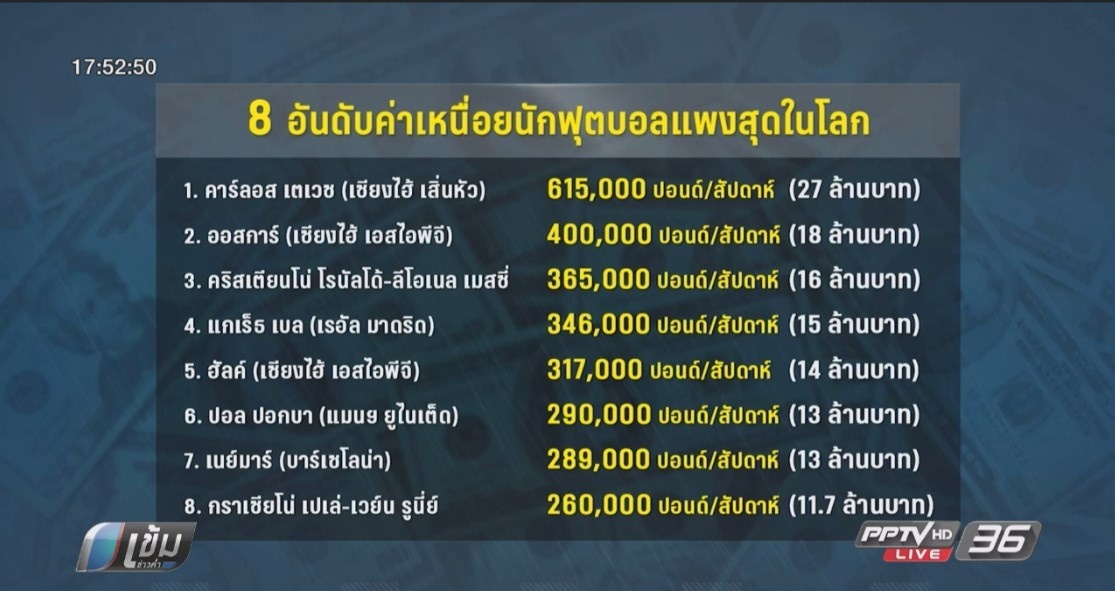 อันดับค่าเหนื่อยนักเตะโลก อันดับ1 เตเบช ของไทย ชัชปุย