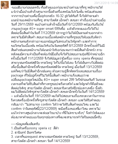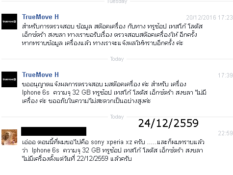 -- ต่อมาในวันที่ 19/12/2559 ผมได้ไปสอบถามเรื่องระยะเวลาในการรอรีเควสเครื่องอีกครั้งที่ทรูสาขาโลตัส เอ็กตร้า สงขลา และได้รับคำตอบกลับมาว่า "ไม่สามารถ confirm ได้ว่าจะได้รับสินค้าตอนไหน และไม่ confirm ว่าวันพฤหัสนี้(22/12/2559) จะมีเครื่องของพี่มาไหม เพราะไม่แน่ใจว่าทางศูนย์กลางจะส่งอะไรมาบ้าง ที่นี่ไม่ทราบจริงๆ" ทำให้ผมหมดเรื่องที่จะถามทันที
