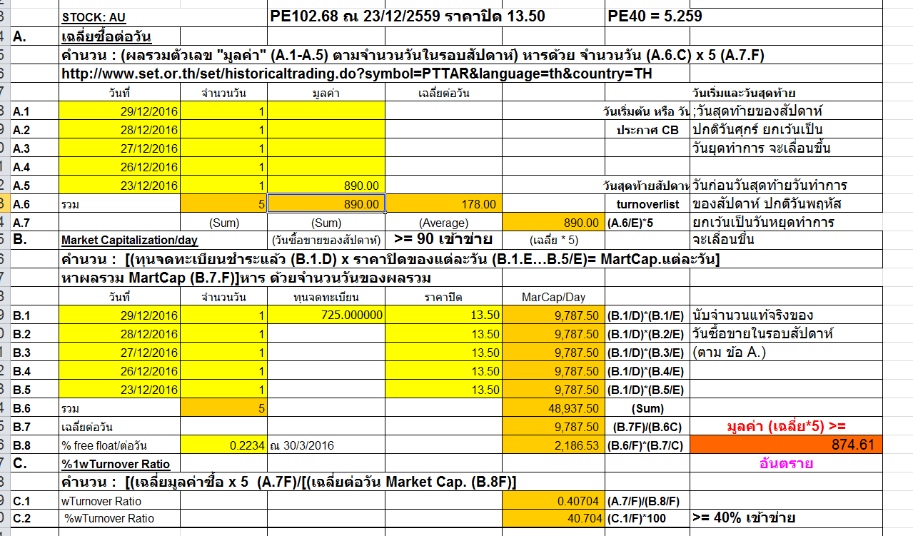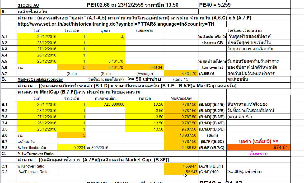 AU ซื้อขายวันแรก 23/12/2559 และ เป็นวันแรกของสัปดาห์ turnover list (23 - 29/12/2559) ร้อนแรงทั้งราคาและปริมาณซื้อถึง 3 พันกว่าล้านบาท ซื้อขายเพียงวันเดียวเข้าข่ายทั้ง 3 หลักเกณฑ์ CB ดั่งแสดงในรูป
