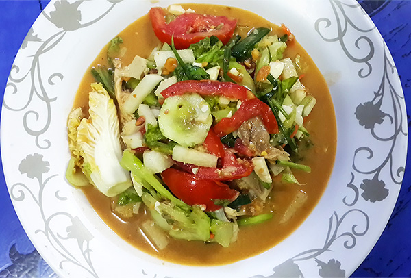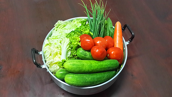 ทำน้ำยำเสร็จแล้ว เราก็ไปล้างผักสารพัดชนิดที่เราหามาให้สะอาด จากนั้นก็นำมาทำเป็นชิ้นๆ ผักใบเขียวใบขาวที่อ่อนตัวเหี่ยวง่าย ก็ทำชิ้นใหญ่หน่อย ส่วนพวกแตงกว่า มะเขือเทศ มันแกว ก็หั่นเป็นชิ้นเล็กๆบางๆ แครอทก็ทำเป็นชิ้นฝอยๆ เพราะเนื้อกรอบแข็ง