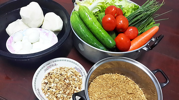 สารพัดผักที่หาได้รวมผลไม้ด้วยก็ยิ่งดี แต่วันนี้ผักที่นิดหามาได้คือ ผักกาดหอม ผักกาดขาว ต้นหอม ผักชี แครอท แตงกวา มันแกว มะเขือเทศ เนื้อไก่ฉีก หมูยอ ไข่ไก่ ถั่วลิสงคั่ว กระเทียมเจียว น้ำมะขามเปียก น้ำตาลเชื่อม พริกคั่วป่น และเครื่องปรุงรส