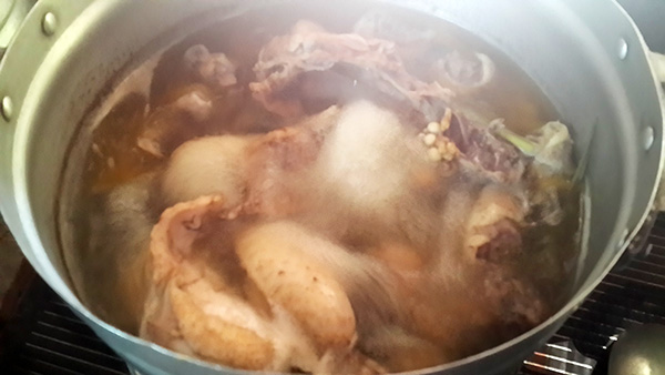 ต้มไก่ให้เนื่อเปื่อยก่อน ปริมาณมากน้อยก็ตามแต่ชอบนะคะ ของนิดใช้ไก่บ้านแค่ตัวเดียวค่ะ เมื่อต้มไก่เปื่อยจนได้ที่แล้ว ยกลง รอให้เย็น แล้วนำมาฉีกเป็นชิ้นๆเล็กๆ หั่นหมูยอเป็นชิ้นๆ พักเก็บไว้