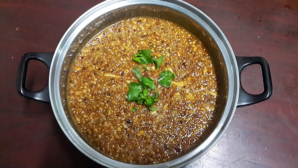 นำมะขามเปียกกำมือหนึ่งมาแช่ในน้ำอุ่นให้เนื้อมะขามเปื่อยยุ่ยแล้วคั้นเอาน้ำให้ได้ประมาณถ้วยหนึ่ง จากนั้นก็ตั้งหม้อน้ำเชื่อมน้ำตาล (กะปริมาณให้พอดีกับเครื่องเคียงอย่างอื่น) สุกแล้วยกลงพักไว้