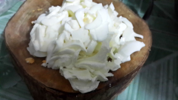 ต้มไข่ให้สุกดี แล้วปอกเปลือกแยกไข่แดง ไข่ขาวออกจากกัน นำไข่ขาวไปหั่นเป็นชิ้นๆ