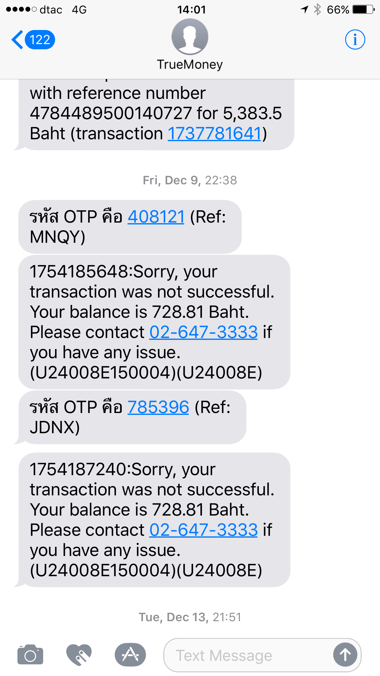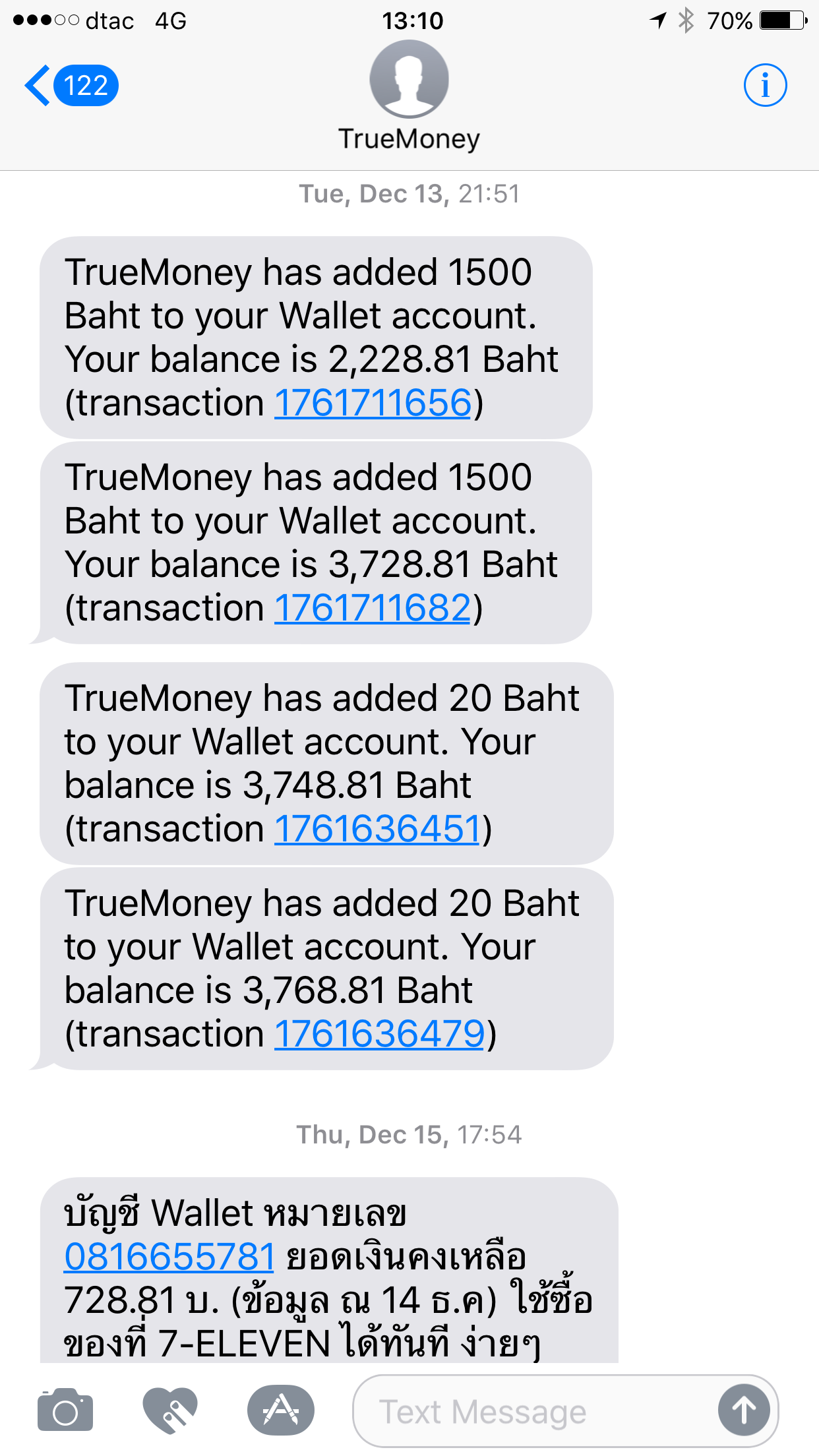 เช้าวันที่ 10 ธ.ค. 59 รอจนสายตรวจสอบยอดเงินก็ปรากฎว่าไม่เข้า จึงติดต่อ Callcenter ผลคือ เจ้าหน้าที่ไม่สามารถตรวจสอบได้ จึงได้ให้ประสานงานให้ติดต่อ supervisor เพื่อรับเรื่องแทน ปรากฎว่า supervisor ก็เร่งรัดประสานงานให้อย่างดี แต่ก็ยังไม่สามารถตรวจสอบได้ จนมีการติดต่อกันไปมาหลายครั้งและได้ข้อสรุปทางฝั่ง wallet ว่า ในระบบได้ตรวจสอบแล้วพบว่า เงินได้ rollback คืนให้ scb และติดวันหยุด อาจต้องรอวัน อังคาร ที่ 13 และได้มีการติดต่อโดยการประชุม 3 สาย ระหว่างเรา scb และ wallet ซึ่ง SCB ก็ยืนยันว่าการโอนสำเร็จแล้ว แต่ก็รับจะไปตรวจสอบเพิ่มเติมให้ ซึ่งก็ได้ติดต่อกันเรื่อยๆ เงินก็ไม่เข้า และ ทาง wallet มั่นใจว่า เงินได้คืนให้ SCB ไปแล้ว แต่รอขั้นตอนให้ SCB คืนให้เรา จนคืน วันที่ 13 ได้มีข้อความว่า “True money has added 1500 baht to your wallet ……..” จำนวน 4 ข้อความ คือ 1500* 2 และ 20*2 (ค่าธรรมเนียม) ซึ่งข้อความนี้ จะไม่เหมือนกับเวลาเราเติมเงินปกติ ซึ่งจะเป็นข้อความอีกแบบ อันนี้ เหมือนไปตรวจสอบเจอว่าผิดพลาด จึงโอนเงินแบบ manual ไปก่อน เพื่อให้ จบเรื่อง