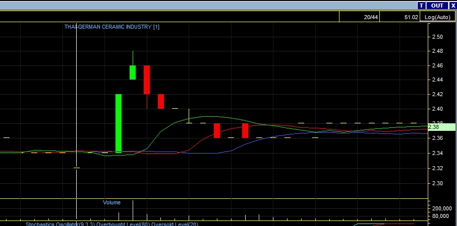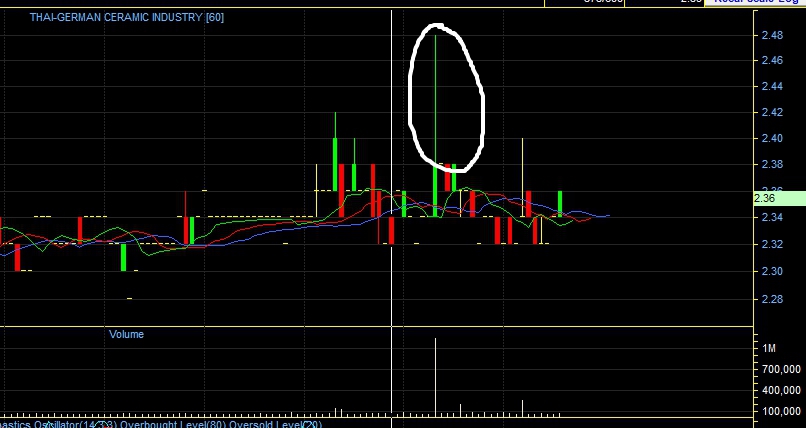 โดยปกติ TGCI มี Vol ค่อนข้างน้อย แต่วันนั้น เฉพาะ ช่วงเช้ากลับมี Vol ถึง 1165000 หุ้น ที่สงสัยคือ เมื่อดู graph 1 min จะเห็นได้ว่าเป็นการเคาะซื้อ แบบรวดเดียว ซึ่งน่าจะเกิดจากการซื้อของคนกลุ่มเดี่ยวจากราคา 2.34 จนถึง 2.48 จากนั้น กลับปล่อยให้ราคาไหลลงกลับมาที่เดิม