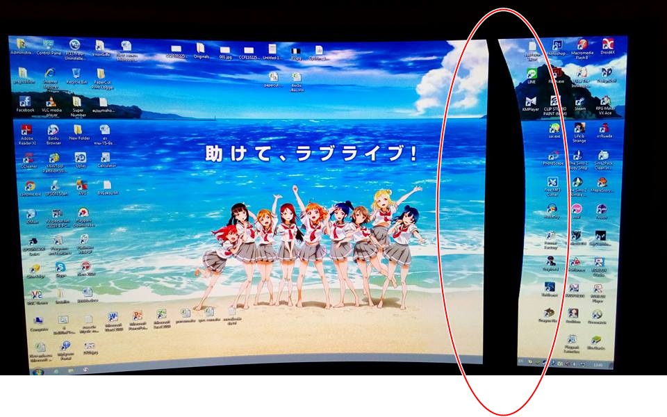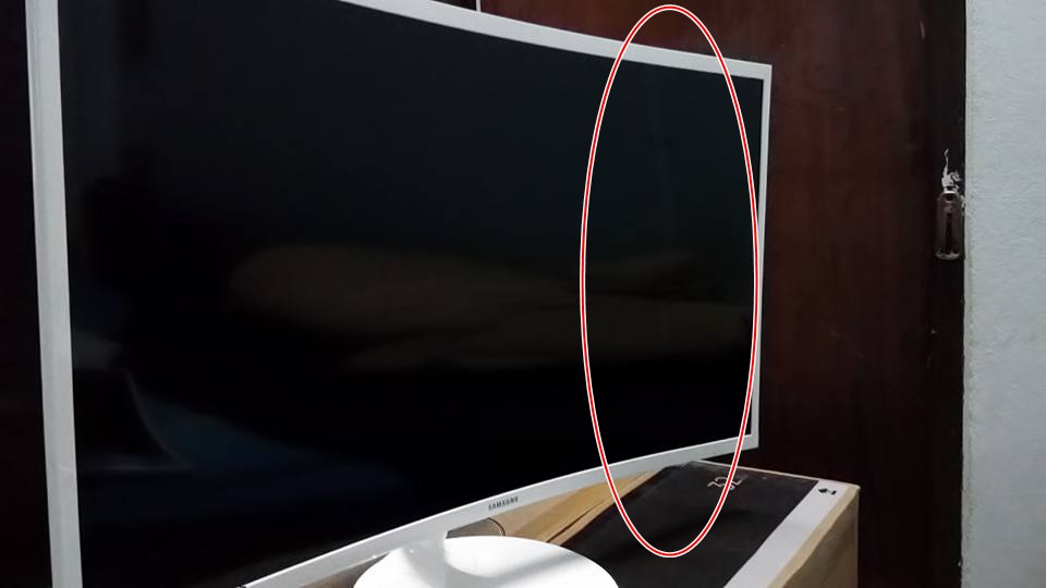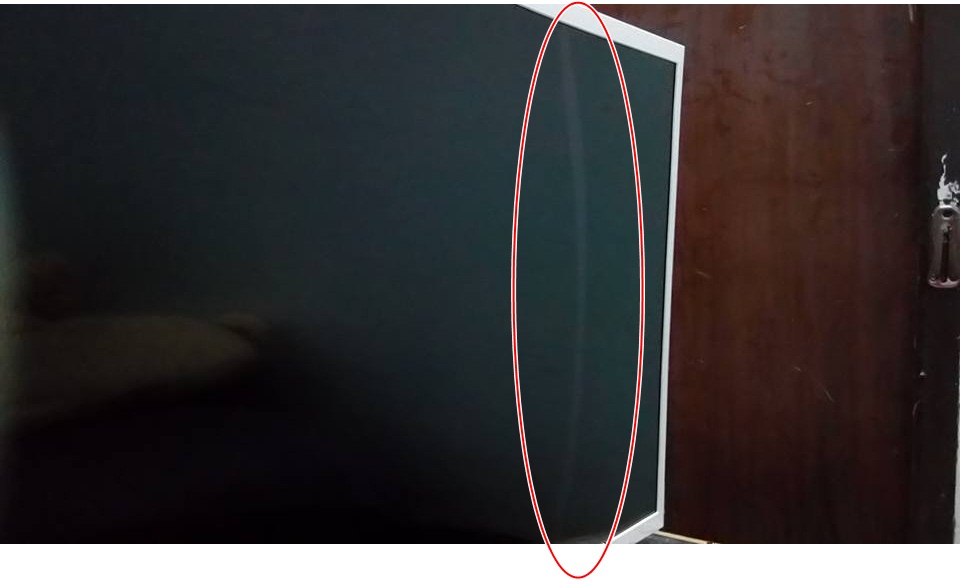 จากนั้นผมจึงเช็คจอตามปกติ ปรากฏว่า 2 จอ ปกติ แต่อีก 1 จอ มีรอยสีขาวๆเป็นแนวตั้งโค้งอยู่ภายใน (ผมคิดในใจ งานเข้าแล้วสิ !)