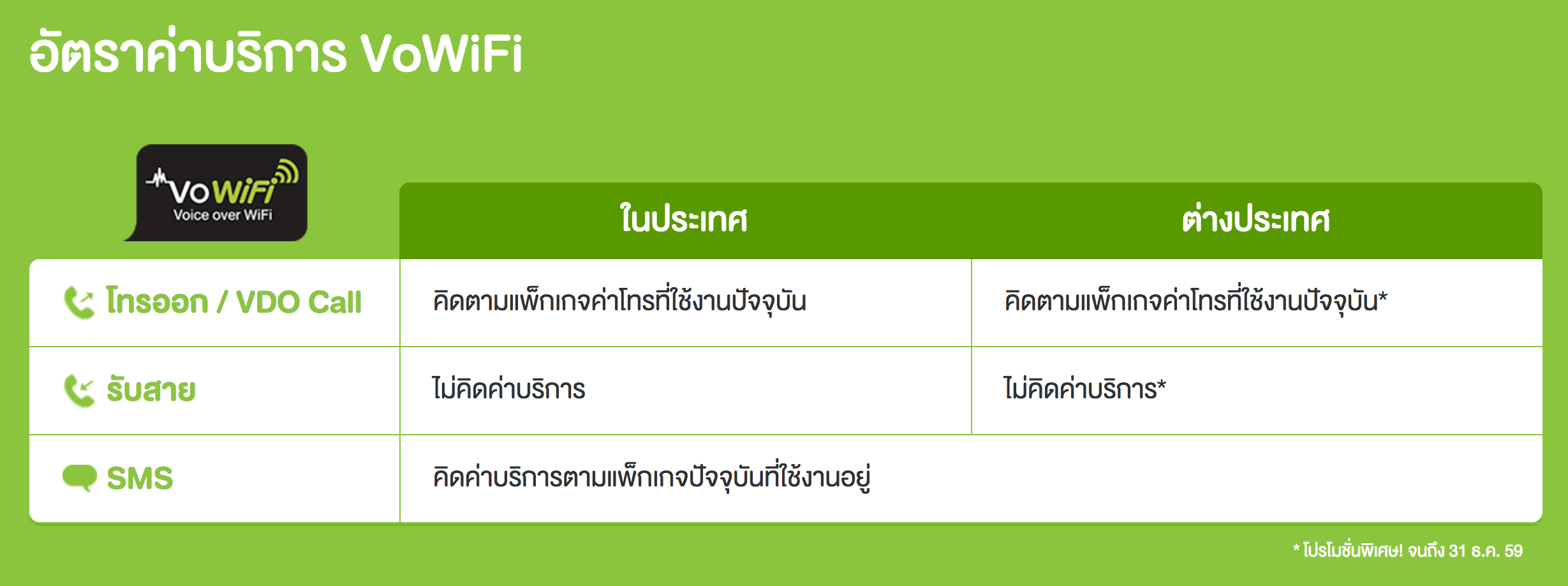สำหรับ AIS VoWiFi (หรือ Voice over WiFi) คืออีกเทคโนโลยีที่เพิ่มช่องทางในการติดต่อสื่อสาร ด้วยโทรออก และรับสายผ่านสัญญาณ WiFi สามารถใช้งานได้ทุกที่ทั่วโลก ที่มีสัญญาณ WiFi โดยไม่จำกัดค่าย WiFi อัตราค่าบริการ ดังนี้ค่ะ