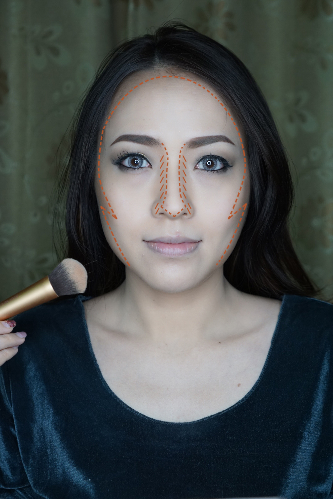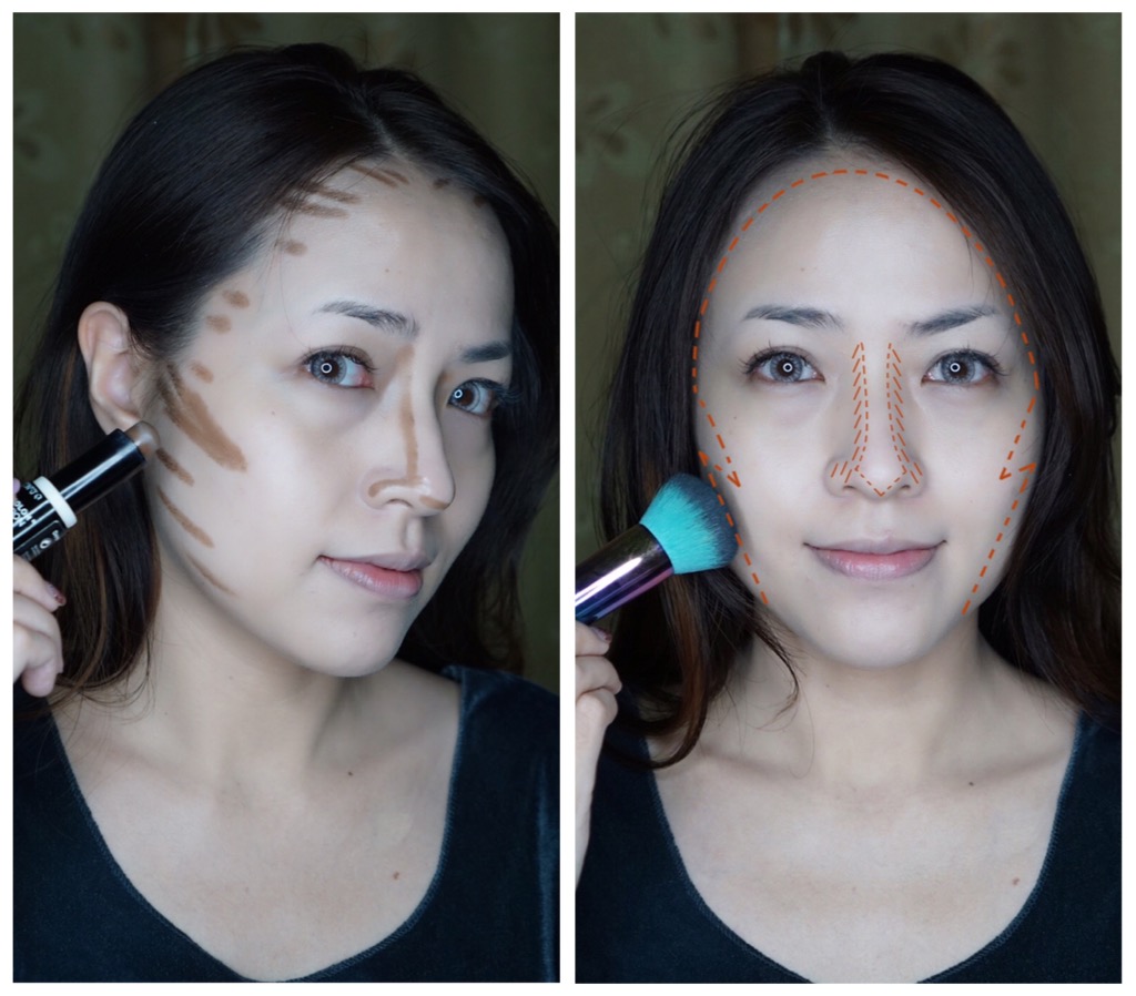 - ใช้ contour ชนิดครีม แต้มตามบริเวณกรอบหน้าตามบริเวณเส้นประในรูป