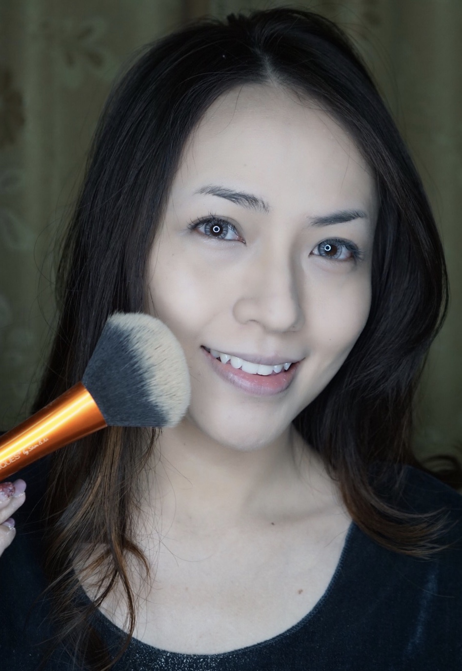 - ใช้แปรง powder blush แตะแป้งฝุ่นและลงแป้งฝุ่นให้ทั่วใบหน้า ใช้แปรงปัดให้เนียนเรียบทั่วหน้า