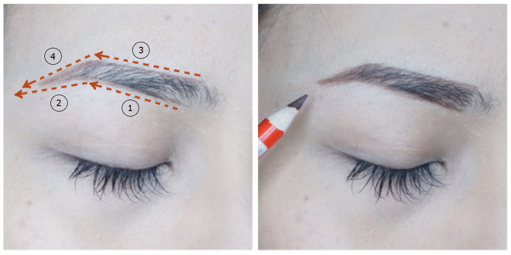 - เริ่มด้วยการเขียนกรอบคิ้ว โดยเขียนเส้นที่ 1-2-3-4 ตามลำดับ อย่าลงน้ำหนักเยอะนะคะ ร่างพอให้เห็นเส้นกรอบคิ้วก็พอคะ
