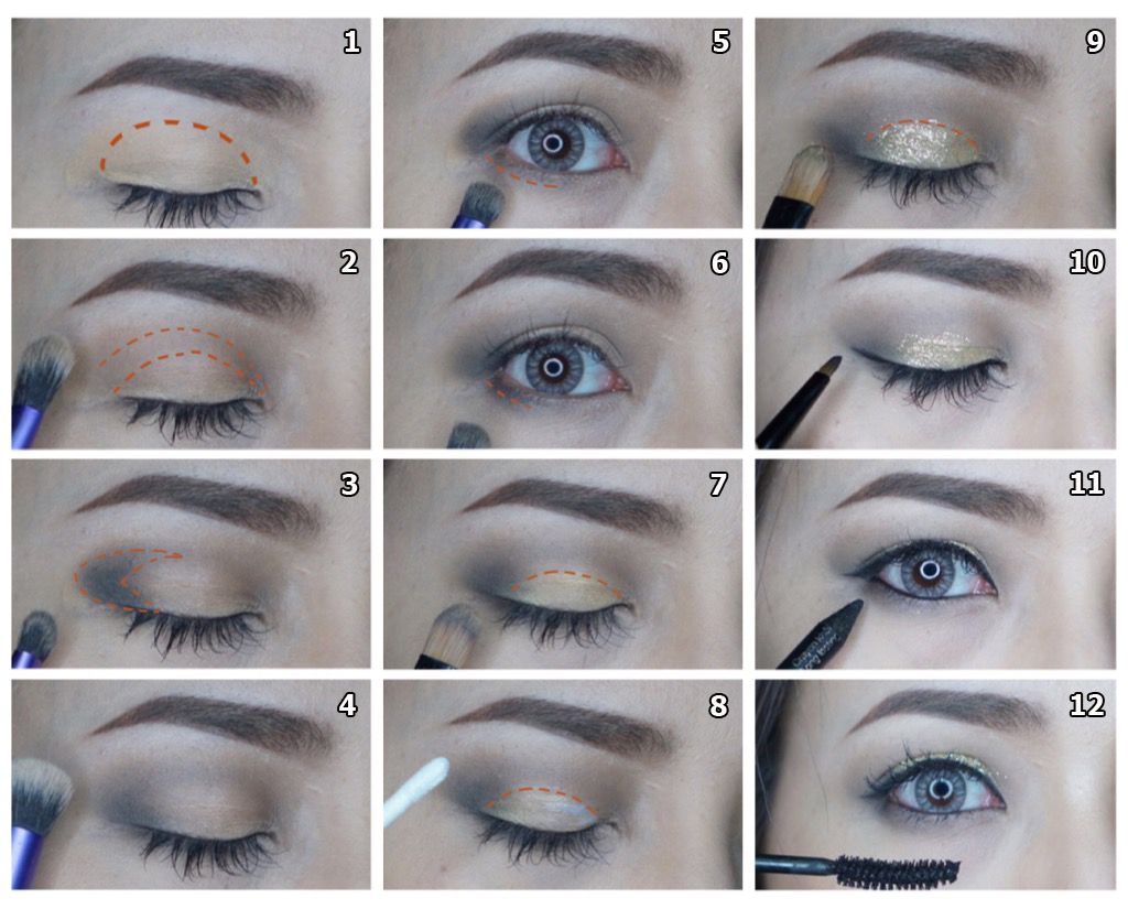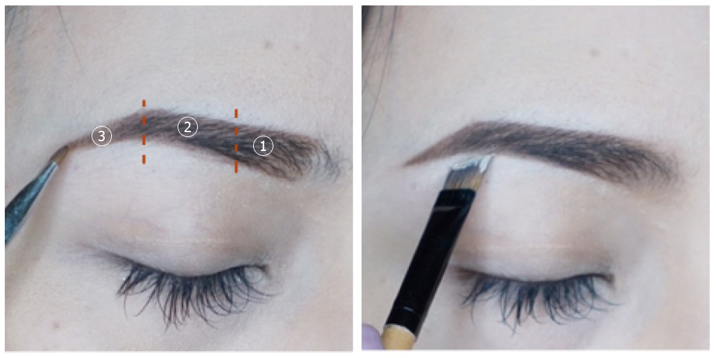 - ใช้แปรงสำหรับคิ้ว แตะพาเลตคิ้วแบบฝุ่น ระบายทับให้เต็มกรอบคิ้วที่เราระบายด้วยดินสอไว้ก่อนหน้านี้ โดยแบ่งคิ้วเป็น 3 ส่วน ส่วนที่ 1 ใช้สีอ่อนที่สุดของพาเลตคิ้ว ส่วนที่ 2 ใช้สีกลาง ส่วนที่ 3 ใช้สีเข้มสุด