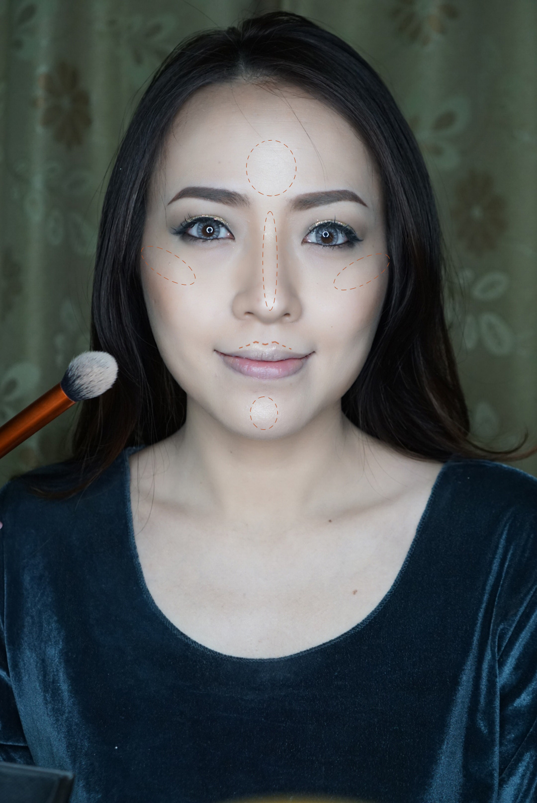 - ปัดไฮไลท์ตามตำแหน่งเส้นประทั้ง 6 จุดตามในรูปข้างบนเลยจ้า แต่ทั้งนี้คนผิวหน้ามันต้องระวังในเรื่องของการปัดไฮไลท์เยอะๆนะคะ เพราะจะทำให้หน้าดูมันและเยิ้มระหว่างวัน