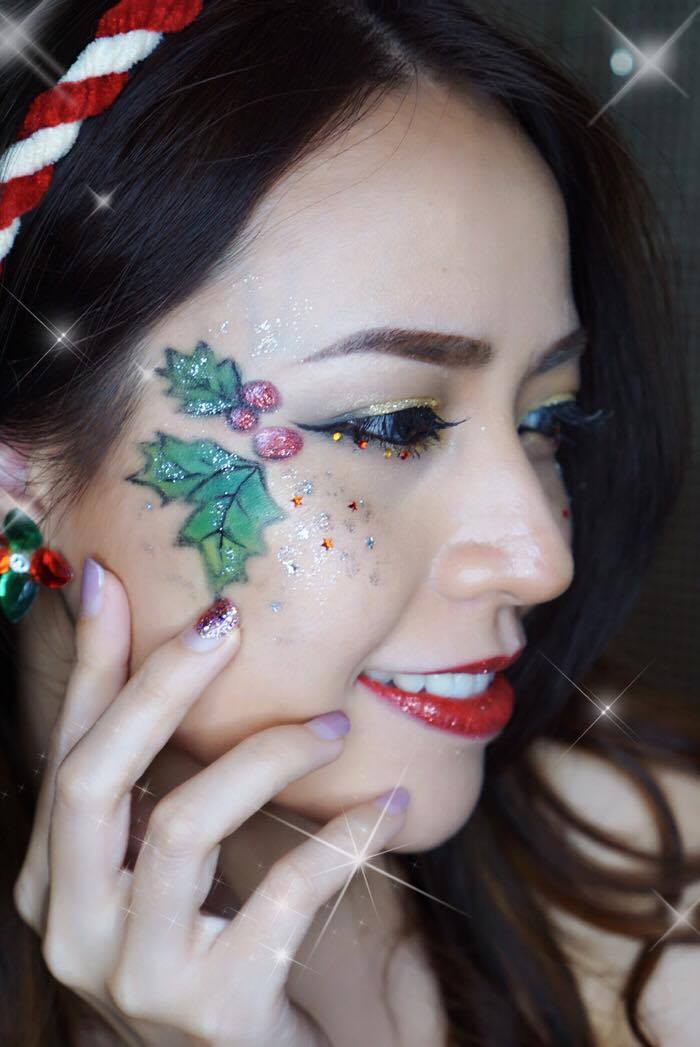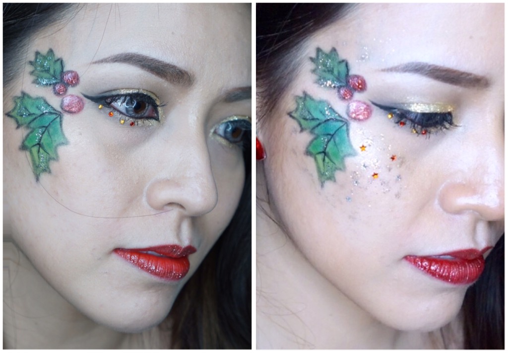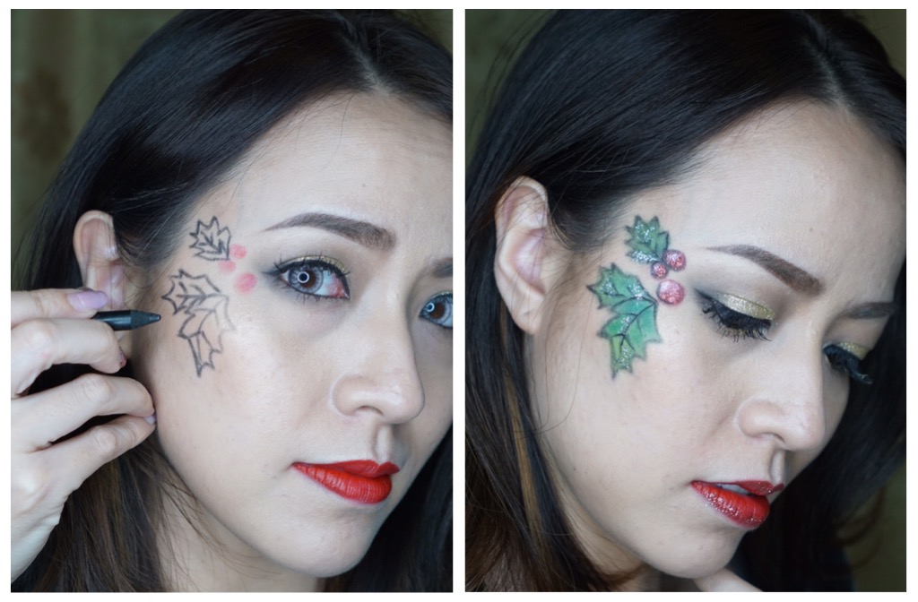 - ใช้ Sephora ดินสอไลน์เนอร์สีดำ วาดลวดลายตามแบบที่เราต้องการ บนตำแหน่งที่เราต้องการจะเพ้นท์ลาย (ก้อยเลือกลาย Holly Treeนะคะ) ใช้ดินสอไลน์เนอร์ร่างใบ และใช้ลิปสติกสีแดงแต้มดำแน่งของลูกHolly