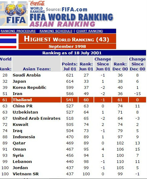 ผมลองไปเข้าเว็บไซด์เก่าๆดูครับ เผอิญไปเจออันดับฟีฟ่าของไทยเมื่อเดือนกรกฎาคม ปี 2001