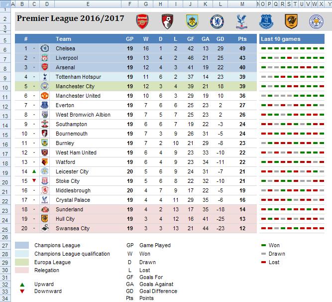 Updated ตารางพรีเมียร์ลีคอังกฤษ 2016/2017 ผ่านมาครึ่งฤดูกาล ฉบับ Excel