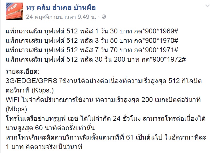 กด*900*1780# ได้เน็ต6Mbps 1วันราคา29฿ กด*900*1781# ได้เน็ต6Mbps 7วันราคา150฿ กด*900*1782# ได้เน็ต10Mbps 1วันราคา34฿ กด*900*1783# ได้เน็ต10Mbps 7วันราคา200฿ ราคายังไม่รวมVat.7% หมด
