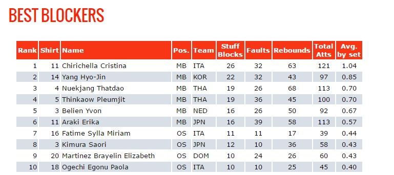 มันก็น่าแปลกเนอะที่mbบล้อกทีไรก็ก้มหน้าเนี่ย ได้สถิติเบสบล็อกตั้งอันดับ3ของทัวร์ แุถมยังติดทอปไฟว์สองคนด้วย ก้มหน้าซะจนบางทีมไม่ยอมให้ลงมาในสนามก็คิดดูเอาละกัน 55 ส่วน mb บล็อกดี ทำหน้าที่หลักได้ดีของยุ่นเนี่ย ก็เห็นจะมีแต่อารากิมังครับที่โผล่มาตรงอันดับ6