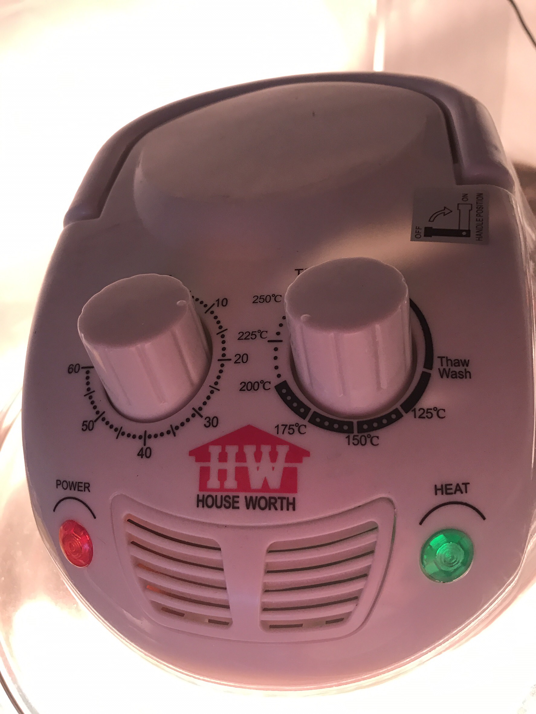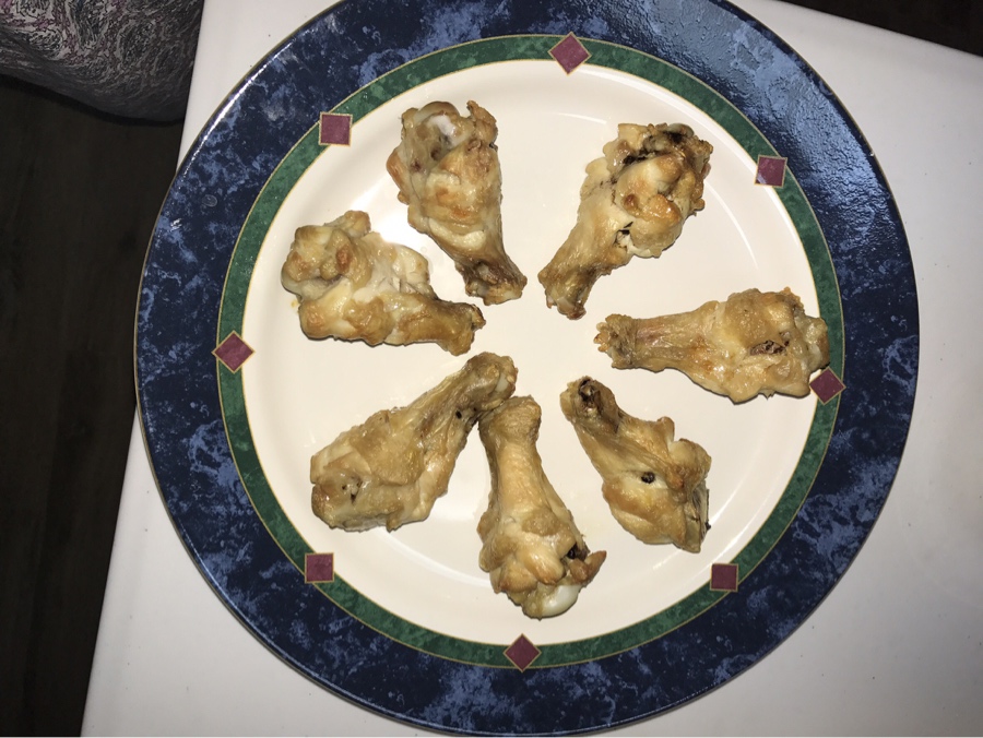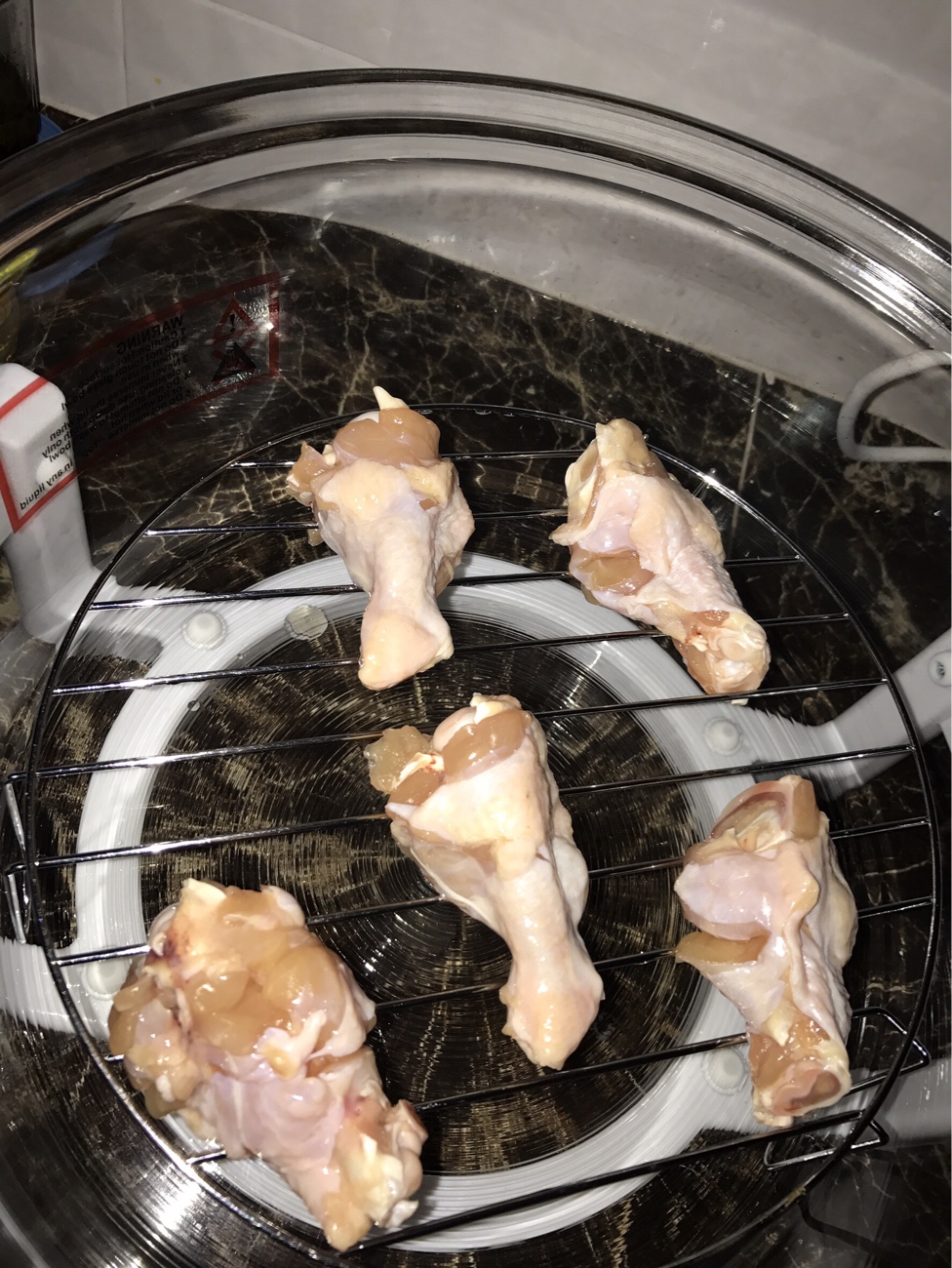 เรียงน่องไก่บนลงบนตะแกรงหม้ออบลมร้อน วางให้ห่างกันเพื่อให้ความร้อนกระจายได้ทั่วถึง อบด้วยไฟ 200 องศา 20นาที แต่อบจริงใช้เวลาแค่ 15 นาที ดีที่ตัวหม้อเป็นโถแก้วสามารถเห็นสีของไก่ได้ด้วย