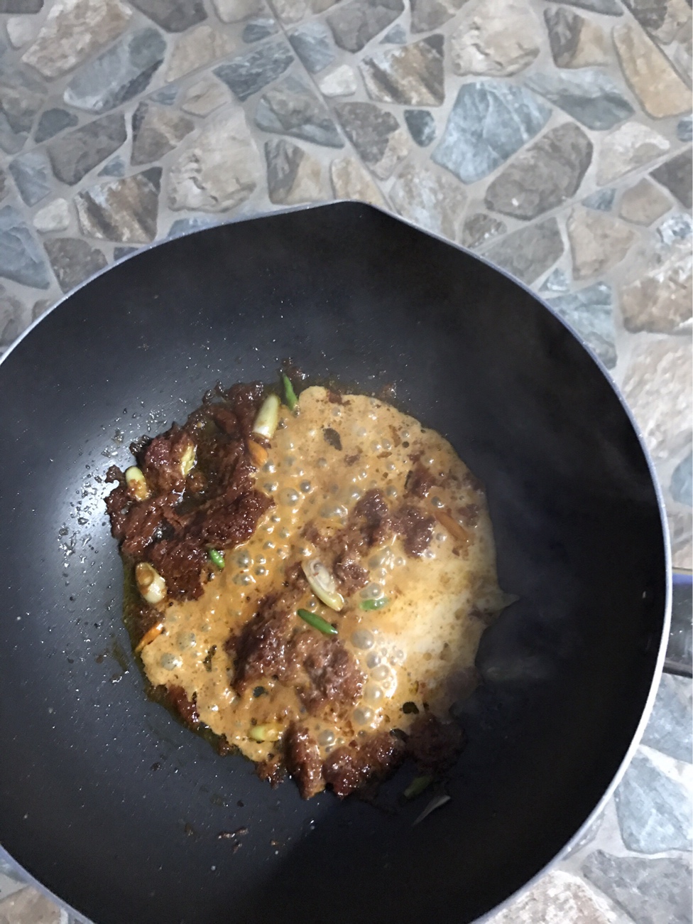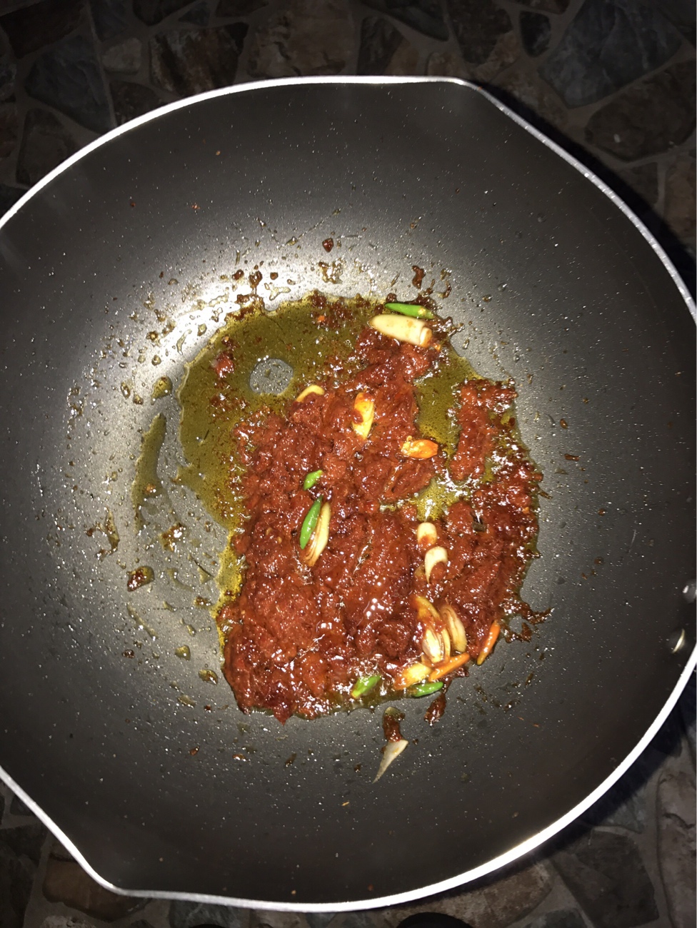 เมื่อนำไก่ขึ้นจากเตาอบแล้ว เตาพร้อม กะทะพร้อม ตั้งไฟให้กะทะร้อน ใส่น้ำมันสัก 3ช้อนโต๊ะ พอความร้อนได้ที่ใส่พริกแกง น้ำตาล น้ำปลา ตะไคร้ ปรุงรสในแบบที่เราชอบเลยค่ะ