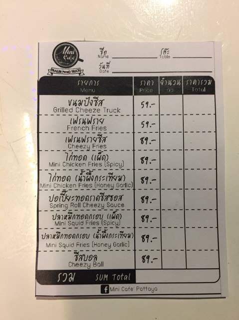 เช็คบิลด้วยเมนูทั้งหมดจากร้าน Mini Cafe' Trailer Food Turck มีขนมปังชีส 3 ก้อน ปอเปี๊ยะทอดราดชีสซอส และ ปลาหมึกทอดกรอบน้ำผึ้งกระเทียม