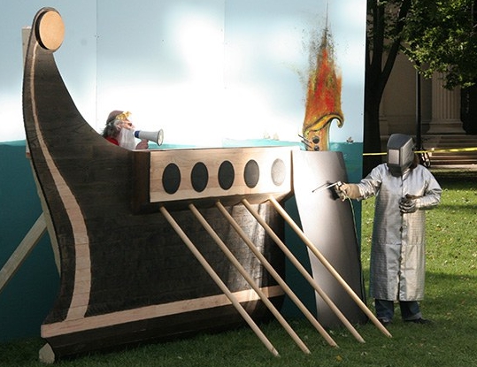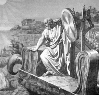 หนึ่งในอาวุธนั้นคือ กระจกรวมแสงที่ทำลายเรือฝ่ายศัตรูด้วยไฟ