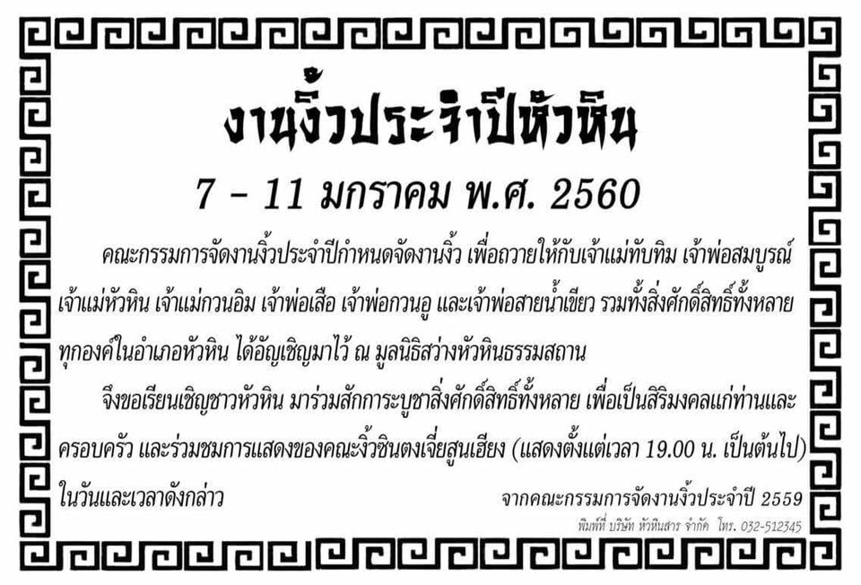 ขอเชิญชมการแสดงงิ้วประจำปี 2560 ที่หัวหิน