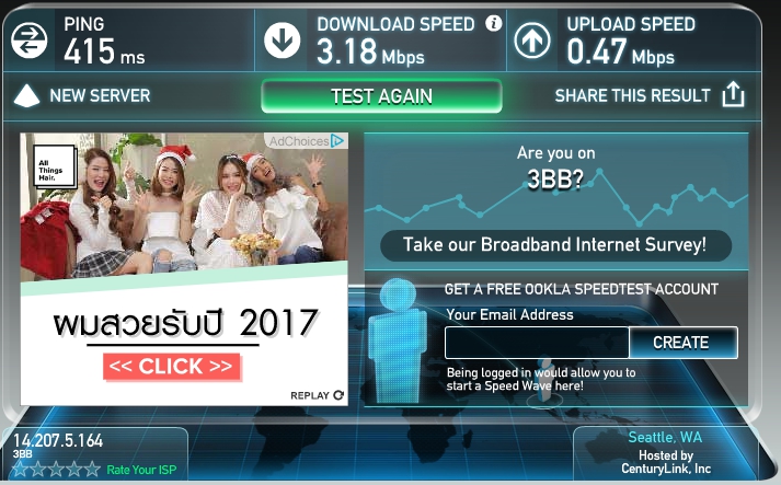 เทสท์ดูหลายรอบ ทั้งไป Seattle, San Francisco, LA ฯลฯ วันแรก ๆ ที่ใช้จะได้ Ping ประมาณ 200 - 230 ms มาวันนี้พุ่งไป 400+ หมดเลย แถมความเร็วจาก 200 Mbps ตกเหลือไม่ถึง 10 Mbps