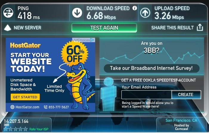 ตอนมาใช้ 3BB วันแรก ๆ ก็โอเคดีครับ แฮปปี้มาก เน็ตเร็วเต็มสปีด ออกนอกก็มีความเร็วตกบ้างเป็นธรรมดา อันนี้เข้าใจได้ แต่ผ่านมาได้ไม่เท่าไหร่ วันนี้รู้สึกเน็ตช้า ๆ เลยลองเทสท์สปีดออกนอกดู ได้ตามนี้เลยครับ