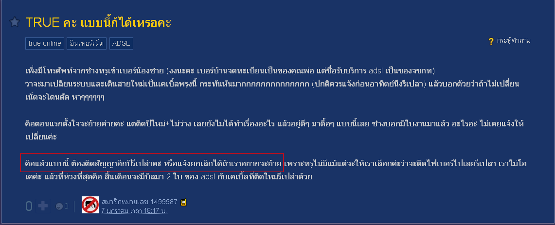 ช่างมาตามเวลานัดติดตั้งให้ในวันอาทิตย์ เมื่อติดตั้งเสร็จ มีใบเซ็น 2 ใบ ซึ่งน่าจะเปนใบงานติดตั้งเดินสาย เพราะถ้าเปนสัญญา ควรจะมีสำเนาให้ลูกค้าและมีข้อตกลงเขียนเปนพรืด อันนี้เหมือนใบส่งของค่ะ เข้าใจว่าใบนึงของโมเด็ม อีกใบกล่องทรู ****จขกทไม่เคยได้คุยหรือมีเมล หรือ sms จากเซลเลยค่ะ ไม่รู้ว่าเปนใครด้วย และไม่มีข้อมูลว่าเน็ต+true vision ของจขกทเปนแพคไหน ค่าบริการเท่าไหร่ ไม่มีรายละเอียดค่ะ หาในเว็บไม่เจอด้วย