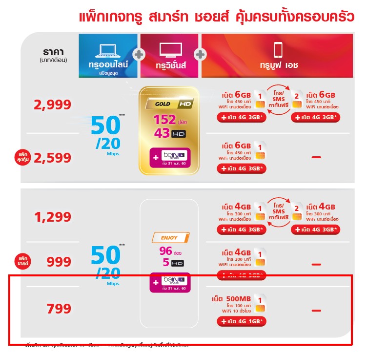 คือตอนนี้ที่บ้านผมใช้ทรู สมาร์ท ชอยส์ 799 อยู่ครับ คือเน็ตบ้าน 200/50 แต่ในราคาเท่ากันผมเห็น มันมีแพ็คเกจที่ดีกว่าในราคาเท่ากันครับ ตามรูป คือผมอยากรู้ว่าผมจะเปลี่ยนได้มั้ย แล้วถ้าเปลี่ยนเบอร์มือถือผม