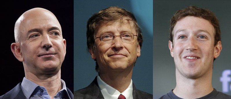 เจฟฟ์ เบซอส ผู้ก่อตั้งเว็บไซต์แอมะซอน (ซ้าย), มหาเศรษฐี บิลล์ เกตส์ และ มาร์ก ซักเกอร์เบิร์ก ผู้ก่อตั้งเฟซบุ๊ก